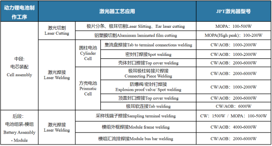 实际上自从2021年开始布局以来,杰普特已经能够完整覆盖动力电池所有激光应用工序,包括前段工序中的极片切割、极片分条、极片清洗,中段工序中的防爆阀焊接、顶盖焊接、转接片焊接、焊前清洗、极耳焊接、密封钉焊接、入壳预焊,后段工序中的模组Busbar焊接、模组正负极耳焊接、模组外罩焊接、PACK托盘支架焊接、电池打标。